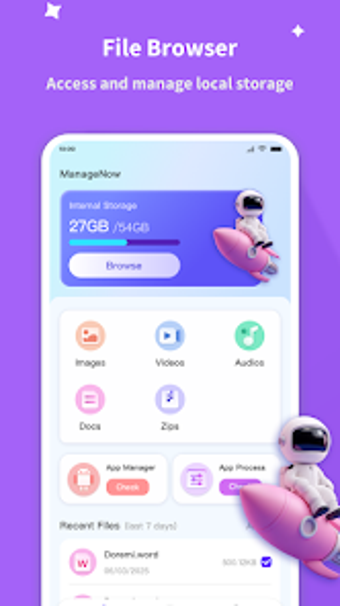 ManageNowは、Androidデバイス向けに設計された無料のユーティリティアプリケーションで、ファイル管理やシステム監視を強化するためのさまざまな機能を提供します。ユーザーフレンドリーなインターフェースを備えたこのアプリを使用すると、ユーザーは画像、動画、文書などのさまざまなタイプのファイルを簡単にブラウズして開くことができます。また、10MBを超える大きなファイルや最近追加されたファイルにアクセスするためのフィルター機能も含まれており、ストレージを効果的に管理するのが容易になります。